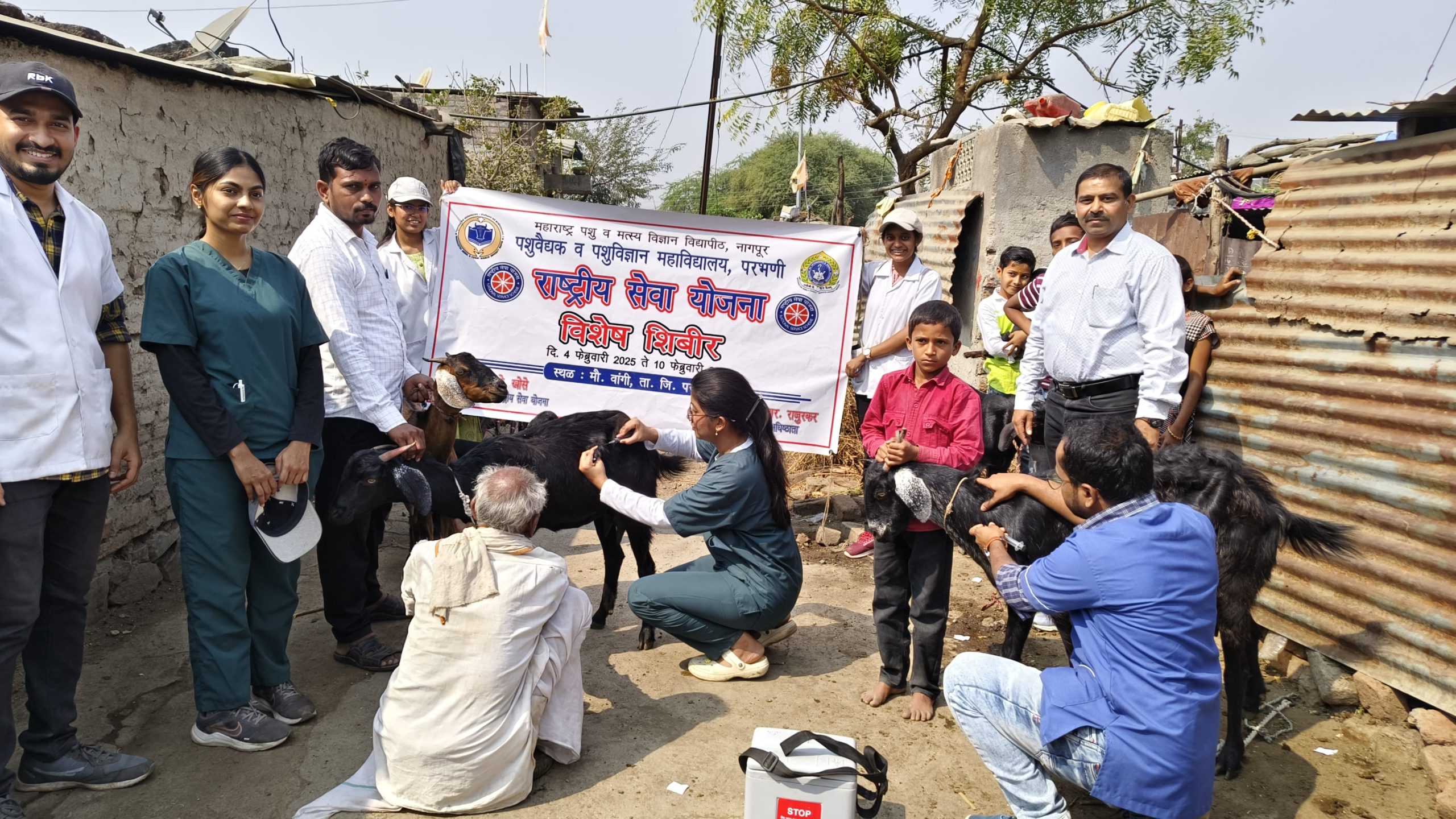परभणी (प्रतिनिधी) पशुवैद्यक व पशुविज्ञान महाविद्यालय परभणी अंतर्गत राष्ट्रीय सेवा योजनेचे विशेष शिबीर मौजे वांगी येथे दिनांक 4 फेब्रुवारी ते 10 फेब्रुवारी 2025 दरम्यान घेण्यात येत आहे. या शिबिरामध्ये पशुसंवर्धन विभाग व पशुवैद्यकीय महाविद्यालय परभणी यांच्या संयुक्त विद्यमानाने मोफत पशुरोग निदान व उपचार शिबिराचे दि. 9 फेब्रुवारी रोजी मौजे वांगी येथे आयोजन करण्यात आले.