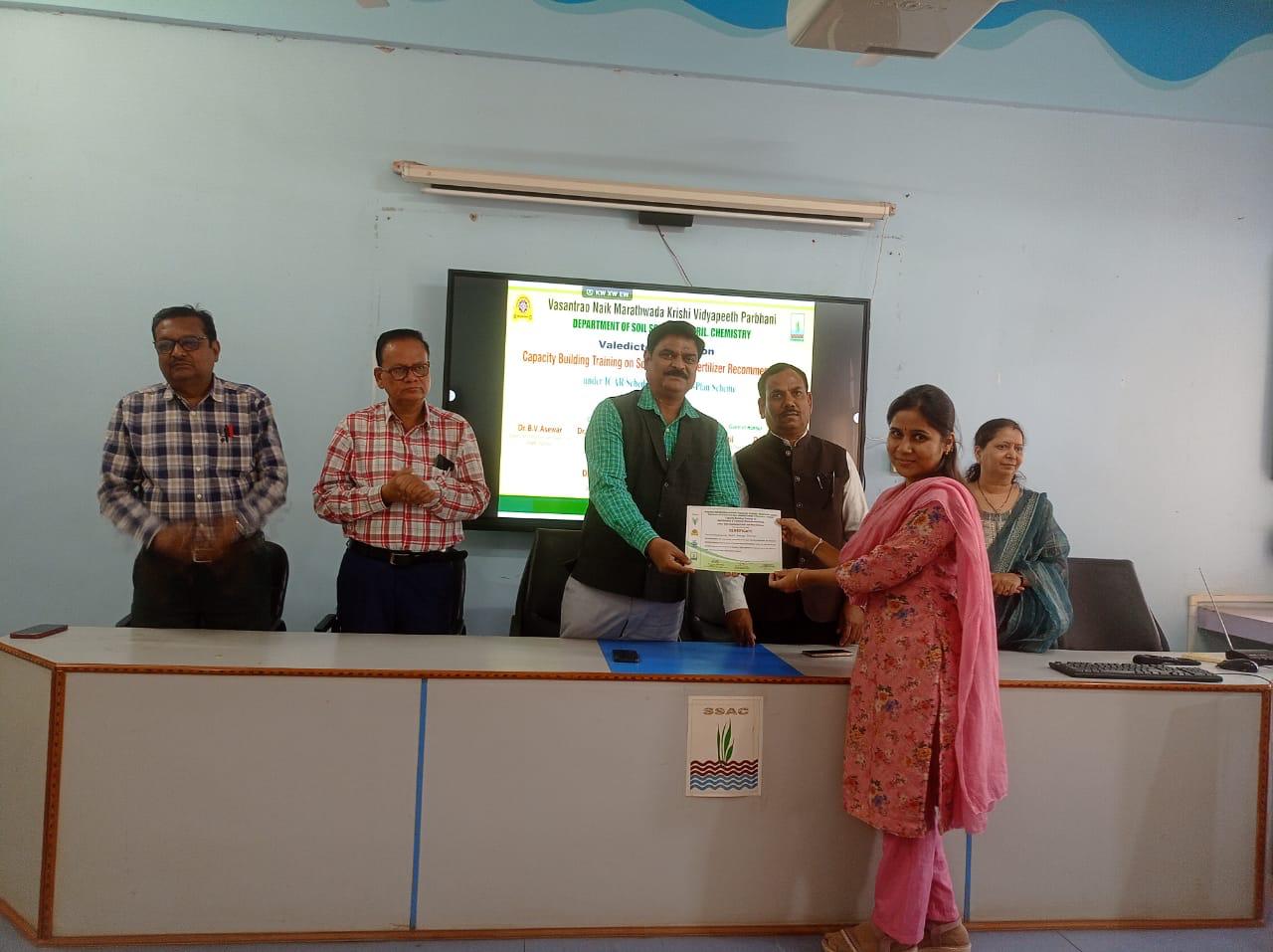 या प्रसंगी व्यासपीठ वर डॉ अनिल धमक, डॉ रामप्रसाद खंदारे, डॉ.संतोष चिक्षे,डॉ स्वाती झाडे, डॉ. सुरेश वाईकर यांची उपस्थिती होती. माननीय डॉ. इंद्र मणी, कुलगुरू, वसंतराव नाईक मराठवाडा कृषी विद्यापीठ परभणी यांच्या प्रेरणेतूनभा रतीय कृषी संशोधन परिषद, नवी दिल्ली आणि कृषी महाविद्यालय परभणी अंतर्गत मृद विज्ञान विभाग यांच्या संयुक्त विद्यमाने माती परीक्षण आणि रासायनिक खतांचा वापर या विषयावर तीन दिवसीय प्रशिक्षण शिबिराचे संपन्न झाले . प्रशिक्षणार्थीना आज व्यासपीठावर उपस्थित मान्यवर यांचेकडून प्रमाण पत्र वितरण केले. याप्रसंगी डॉ. भगवान असेवार, संचालक शिक्षण तथा अधिष्ठाता कृषी, डॉ. प्रवीण वैद्य, सहयोगी अधिष्ठाता आणि प्राचार्य, डॉ.हरिहर कौसडीकर प्रशिक्षण संचालक यांनी प्रशिक्षण कार्यक्रमाचे आयोजन करण्या संदर्भात मार्गदर्शन केले.
