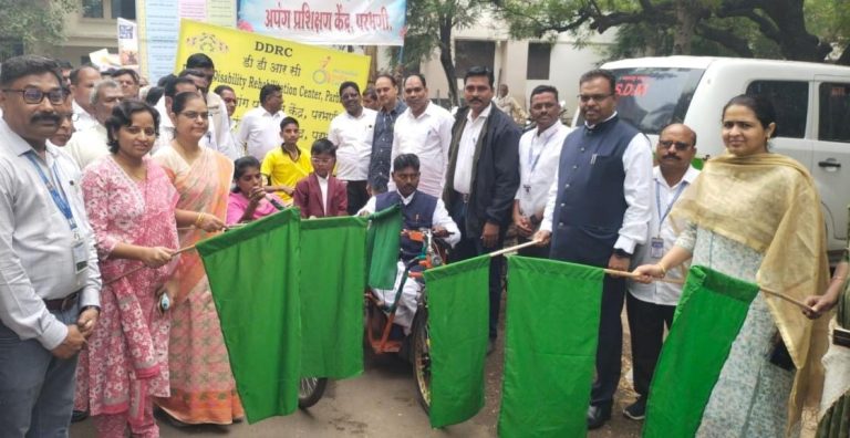 परभणी, (प्रतिनिधी) आंतरराष्ट्रीय दिव्यांग दिनानिमित्त आयोजित रॅलीस जिल्हाधिकारी रघुनाथ गावडे यांच्या हस्ते आज जिल्हाधिकारी कार्यालयात हिरवी झेंडी दाखविण्यात आली. परभणी जिल्ह्यातील सर्व दिव्यांगांच्या शाळा, शाळेतील विद्यार्थी व कर्मचारी यांची प्रभातफेरी आज काढण्यात आली.