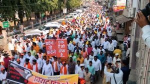 परभणी,(प्रतिनिधी) : गेल्या काही दिवसांपासून बांगलादेशातील हिंदु समाजावर जाणिवपूर्वक होणार्या अन्याय, अत्याचारासह हल्ल्यांच्या निषेधार्थ सकल हिंदु समाजाच्या वतीने आज मंगळवारी (दि.10) सकाळी 10 वाजता जिल्हाधिकारी कार्यालयावर विराट मोर्चा काढण्यात आला. या मोर्चात महिला व युवकांचा मोठ्या प्रमाणात सहभाग होता.