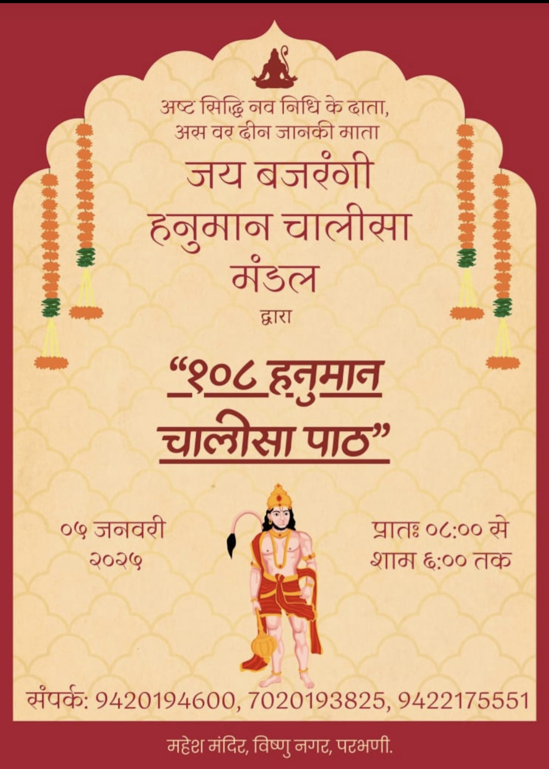 नववर्षानिमित्त सर्वांना शुभेच्छा तसेच 2025 हे वर्ष सुख, समाधान आणि शांतीचे तसेच भरभराटीचे जावो यासाठी दरवर्षी जय बजरंगी हनुमान चालीसा मंडळ सामूहिक संगीतमय हनुमान चालीसा पठणाचे आयोजन करते. यावर्षीचे हे पाचवे वर्ष आहे. विष्णू नगरातील महेश मंदिरात सकाळी 8.00 वाजता श्री राम, लक्ष्मण सीता आणि हनुमान यांच्या प्रतिमा पूजनाने या संगीतमय हनुमान चालीसा पठणाला प्रारंभ होणार आहे. दिवसभर शेकडो हनुमान भक्त भाविक सह परिवार यामध्ये सहभागी होणार आहेत. सायंकाळी 6.00 वाजेपर्यंत अखंडपणे संगीतमय हनुमान चालीसाचे पठण करण्यात येणार आहे. साडेसहा वाजता मंदिर परिसरात अकराशे दिवे प्रज्वलित करून शांततेसाठी तसेच सुख समाधानासाठी प्रार्थना करण्यात येणार आहे. त्यानंतर महाआरती होणार आहे. मागील पंधरा वर्षापासून बजरंगी हनुमान चालीसा मंडळ शहरात वेगवेगळ्या हनुमान भक्तांच्या घरी हनुमान चालीसा पठण करते. यामध्ये 100 हून अधिक हनुमान भक्त परिवार जोडले गेलेले आहेत.